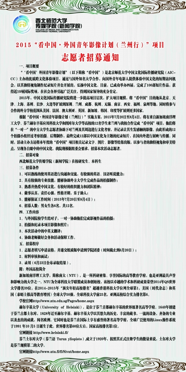 “2015"看中国·外国青年影像计划(兰州行)"项目西北师大365上市公司(新闻学院)志愿者招募通知