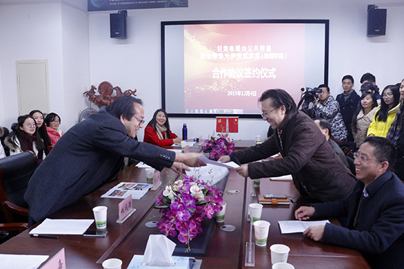 365上市公司(新闻学院院长)徐兆寿与甘肃电视台公共频道总监姚成德签署了《出镜记者、见习主播定向实训计划合作备忘录》,根据协议,学院定期选派10名优秀学生担任甘肃电视台公共频道出镜记者和见习主播,以全省第一档大型直播民生新闻节目《百姓有话说》为实训基地,由频道选派主播、资深记者担任实训指导老师,帮助学生适应胜任频道主要直播新闻节目出镜记者工作,优秀出镜记者可遴选推荐担任频道其他节目见习主播,特别优秀的出镜记者可推荐担任《百姓有话说》节目见习主播,在条件成熟后建议甘肃省广播电影电视总台引进或办理派遣聘用手续。