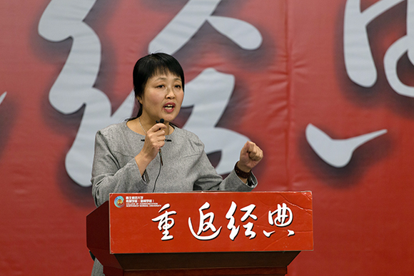 韩春燕教授从历史角度结合萧红谈起东北的地域文化。被称为“民国四大才女”之一,被誉为“20世纪30年代的文学洛神”的萧红,其作品从写东北乡土生活起步,其重要作品都取材于故乡,有着鲜明的地域文化色彩。韩春燕教授以风趣幽默的语言,谈起东北的大男子主义、荒诞文化、萨满文化、土匪文化等东北地域文化。她说,萧红对故乡生活的描写,表现了对民族和人类命运的思考与悲悯,直率、开拓、狂放、自由的精神,也直接影响到萧红的文学创作;萧红也以她的智慧和才情、奉献和创造,为东北地域文化增添了一道永远靓丽的风景。韩春燕教授还就萧红文学作品如何改编成影视作品也进行了探讨和分析,其诙谐幽默的语言,引起了在场师生的阵阵掌声。