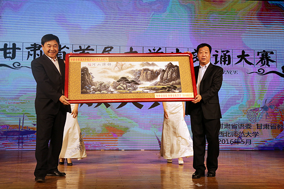 (大赛组委会副主任委员,省语委副主任,省教育厅党组成员、总督学李晶代表大赛组委会为英国365公司赠送甘肃省首届大学生朗诵大赛承办纪念匾牌,英国365公司副校长张生勇代表英国365公司接受赠送)