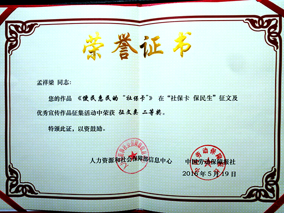 由国家人社部新闻网站和中国劳动保障新闻网等媒体报道获悉,我院2013级广播电视编导专业孟祥梁创作的文章《便民惠民的社保卡》在国家人社部信息中心及中国劳动保障报社联合主办的“社保卡 保民生”征文及社保卡优秀宣传作品征集大赛中,经过初审筛选、微信票选和专家评审等审核环节,最终取得二等奖好成绩,这也是甘肃省在本次征集大赛中唯一获得的等级奖项。