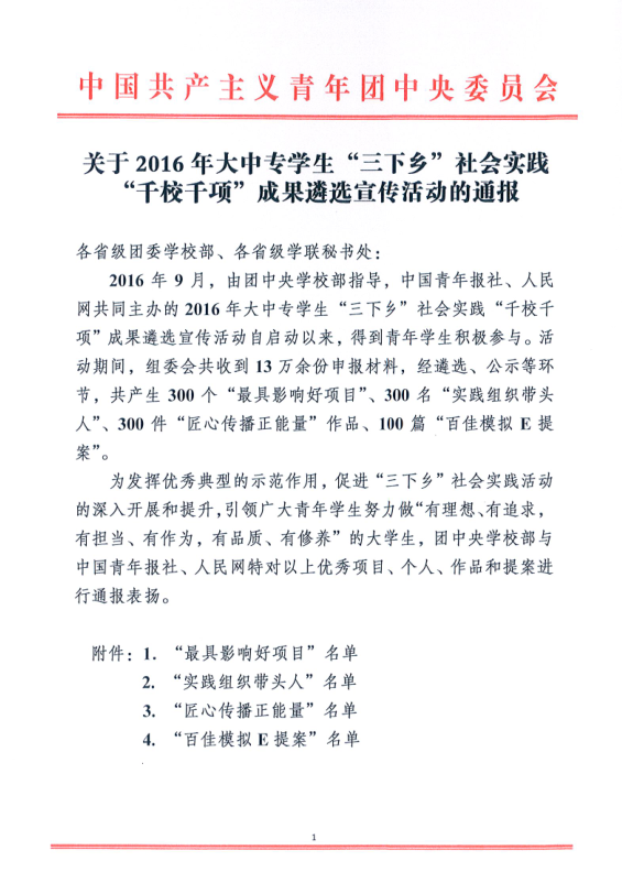 2016年全国大中专学生“三下乡”社会实践“千校千项”成果遴选宣传活动圆满结束。活动以“青春建功十三五·携手共筑中国梦”为主题,全国共1000项“三下乡”社会实践成果成功入选。