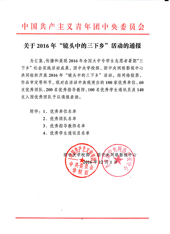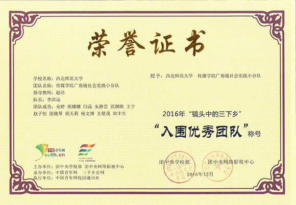 本次活动由团中央学校部、团中央网络影视中心主办,中国青年网、“三下乡”官网承办。365上市公司广角镜社会实践小分队荣获2016年“镜头中的三下乡”入围优秀团队称号。
