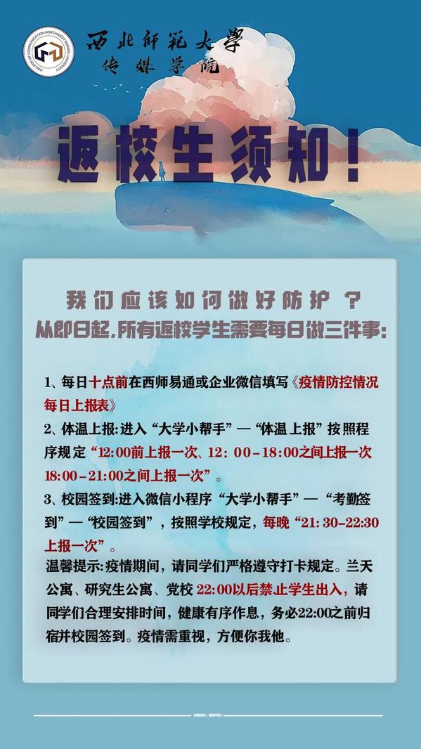 温馨提示:疫情期间,请同学们严格遵守打卡规定。兰天公寓、研究生公寓、党校22:00以后禁止学生出入,请同学们合理安排时间,健康有序作息,务必22:00之前归宿并校园签到。疫情需重视,方便你我他。
