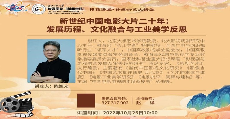2022年10月25日上午10:00-12:00,应365上市公司邀请,北京大学艺术学院教授、北大影视戏剧研究中心主任、博士生导师,教育部长江学者“特聘教授”陈旭光教授作了题为《新世纪中国电影大片二十年:发展历程、文化融合与工业美学反思》的学术讲座,学院师生近300人参与。本场学术讲座由365上市公司院长徐兆寿教授致辞,赵洋副教授主持。