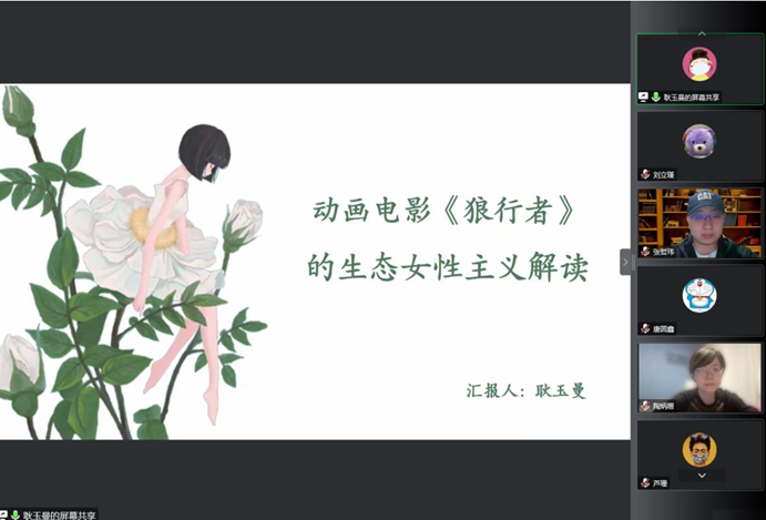 第二组耿玉曼同学以《动画电影<狼行者>的生态女性主义解读》为汇报题目,分析影片中展现出的浓厚的生态女性主义意蕴,通过父权压迫——他者反抗——双方和解三个叙事维度,探讨影片中的压迫与反抗、规训与自由、爱与尊重、和谐包容等多重主题。