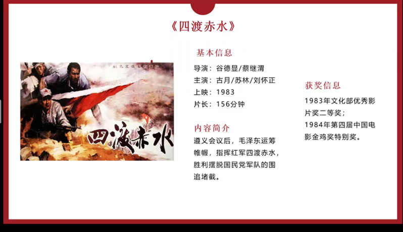 最后一组丁子涵同学以《实景还原红军长征传奇战例——1983<四渡赤水>》为题目,分析影片的叙事风格和实景还原历史原貌的艺术策略,探讨影片如何通过现实主义风格表现强烈的艺术真实和历史真实。