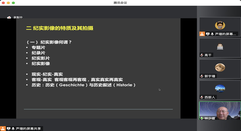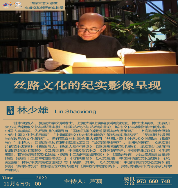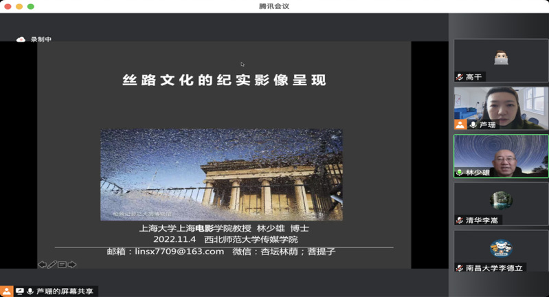 2022年11月4日上午,复旦大学文学博士、上海大学电影学院博士生导师林少雄教授应邀为我院师生开展题为《丝路文化的纪实影像呈现》的学术讲座,365上市公司副教授芦珊主持讲座,365上市公司百余名师生在线聆听了林少雄老师的学术分享并互动交流。