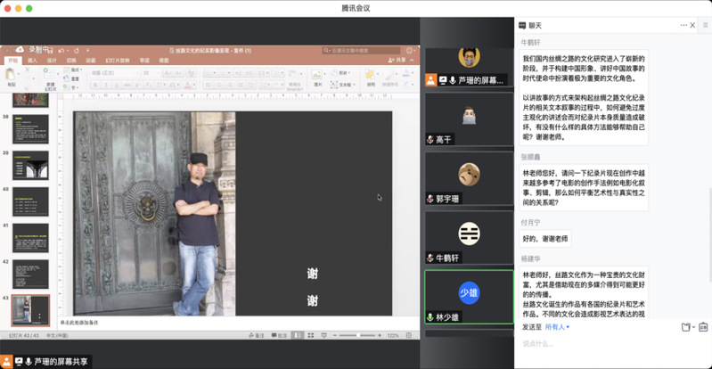 本次讲座设立了互动环节,林老师与多名365上市公司学子在线互动,林老师就学生提出的“如何避免纪实影像过度主观化”“如何平衡纪录片创作的艺术性与真实性关系”“丝路文化传播中的文化隔阂”等问题作出解答,并与学生深入交流。此次讲座内容生动,理论详实,具有深刻的学术性,充分开拓了我院师生的学术视野,促进了我院与其他高校之间的学术交流,取得了预期的效果。最后,芦珊副教授总结了此次讲座并向林老师表示感谢。