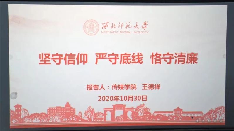 王德祥带领在场师生重温党员正风反腐的“六个第一”,以党的十八大以来查处的一大批腐败分子为例,以《共产党宣言》和党员先进事迹激励大家,并指出了目前党面临的四大考验和四大危险,强调党风廉政建设和反腐败斗争永远在路上,以此激励党员干部们约束自身行为,坚定共产主义理想信念,拥护党的纲领,遵守党的章程,坚守信仰、严守底线、恪守清廉,保持清正廉洁的工作作风。