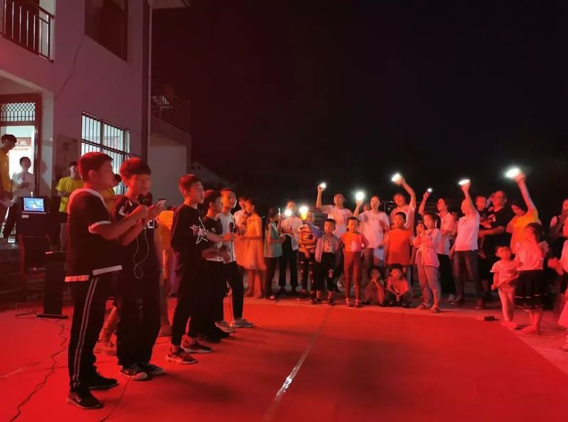 夜色笼罩下的蒲陈村党员活动室广场聚满了前来观看节目的村民,各位实践队员和孩子们一同表演朗诵、独唱、舞蹈、绕口令等各种形式的节目。苟乐乐等八位小朋友“现学现用”,表演了脱贫攻坚为主题的《拍手歌》;实践队员周昱含与六位小朋友带来舞蹈《咖喱咖喱》,孩子们看着开朗的领舞老师,也都跟着大胆跳起了舞;王冬阳等八位实践队员演唱的歌曲《老男孩》引起全场观众一同合唱;全体小朋友一同朗诵散文《少年中国说》后,艺术节落下帷幕。