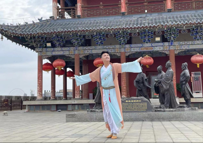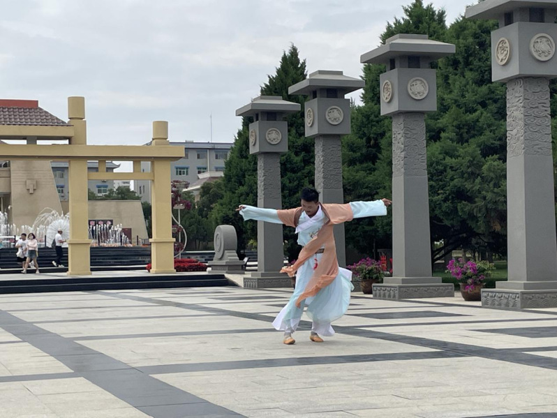 在擂台广场前,董斌老师以舞蹈为媒,巧妙地将现代艺术与古老建筑融合在一起,他轻盈跳跃,身姿曼妙,用舞蹈呈现璀璨的凉州文化。