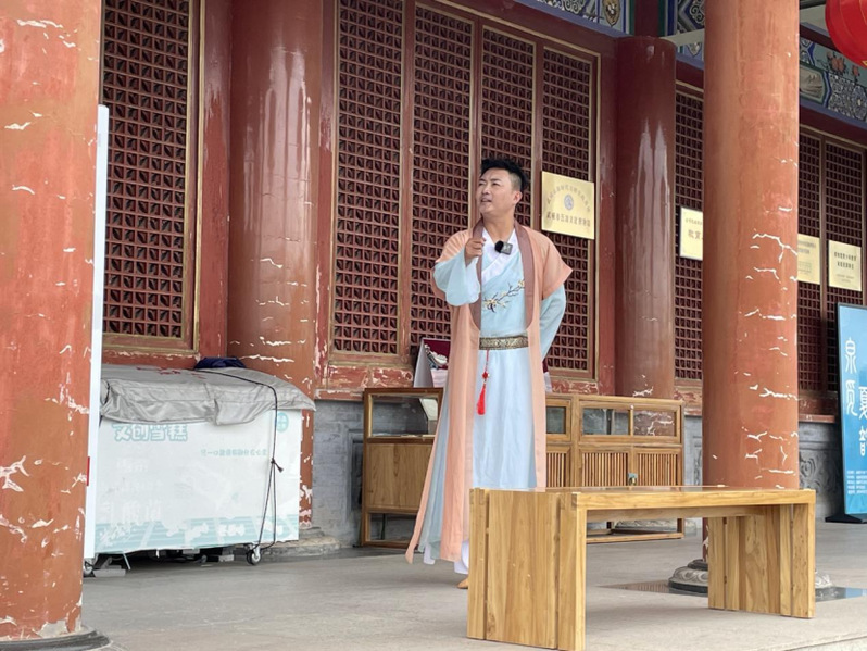 在这座见证了武威历史兴衰变迁的南城门楼上,董斌老师着一身青衫,深情地朗诵着“唯有凉州歌舞曲,流传天下乐闲人”,讲述着凉州的古老故事。董斌老师的朗诵与斑驳的城门交相辉映,凉州文化传播实践团的队员们再次身临其境地欣赏一曲曲凉州舞曲。