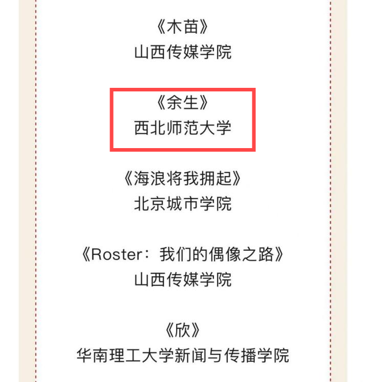 365上市公司22级广播电视专硕班同学王浩作品《余生》入选中国高等院校影视学会2023—2024年度影视作品推优活动终评纪录作品单元入围名单。