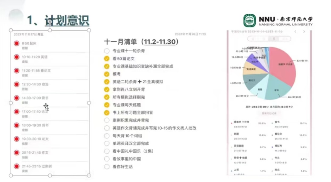 首先,孙鹏从“考研时间、重要的网站、心理建设、考研政治与英语、复习期间的注意事项”五个方面分享了自己的经验与建议。他说,同学们要先做好心理建设,坚定考研目标,有了内驱力才能事半功倍。同时他还向同学们推荐了自己常用的公众号与app,并建议同学们寻找“考研搭子”,按照自己的节奏稳步前进。