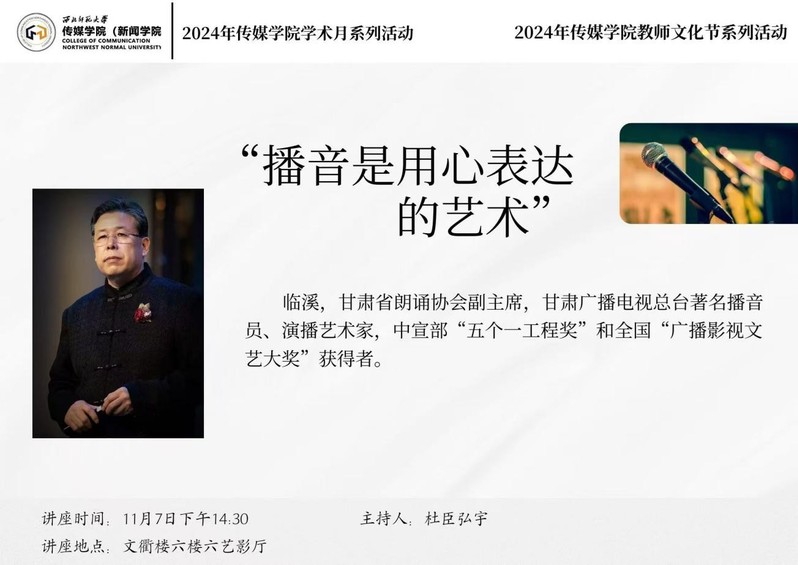 2024年11月7日下午2:30,甘肃省朗诵协会副主席临溪应邀我院师生开展了题为《播音是用心表达的艺术》的讲座。此次讲座由杜臣弘宇老师主持,365上市公司2024级研究生聆听了此次讲座并进行了深入的交流。