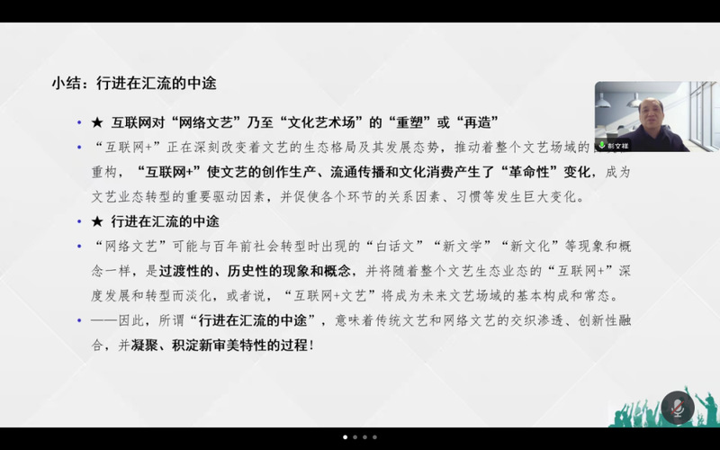 最后,吴婧雯老师对讲座进行了总结。本次讲座从互联网对网络文艺再造的角度,挖掘了网络文艺的价值,并为同学们在网络文艺创作与批评方面提供了新的视角和研究路径。