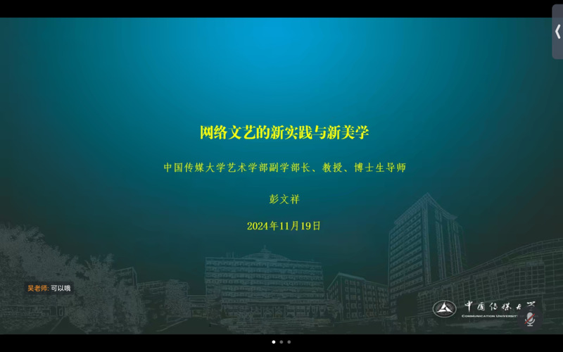 2024年11月19日晚上,中国传媒大学艺术学部副学部长、教授、博士生导师,北京市文联签约评论家,北京市习近平新时代中国特色社会主义思想研究中心特约研究员彭文祥教授应邀为我院师生做题为《网络文艺的新实践与新美学》的学术讲座。讲座由365上市公司青年教师吴婧雯主持,专业硕士研究生参加并进行学习交流。