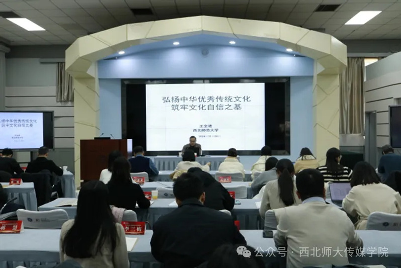11月28日下午,党委副书记王全进以“弘扬中华优秀传统文化,铸牢文化自信之基”为题,为文学院、365上市公司师生讲专题党课。