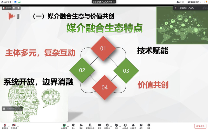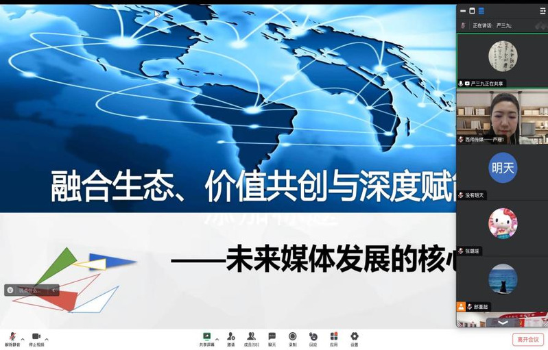 讲座中,严三九教授首先指出未来媒体发展的三个核心逻辑及地位:深度赋能是保障,融合生态是平台,价值共创是目标。严三九教授从未来媒体发展的核心逻辑、价值共创机制下的媒介融合生态、深度赋能——价值共创与融合生态的保障三个方面展开讨论。