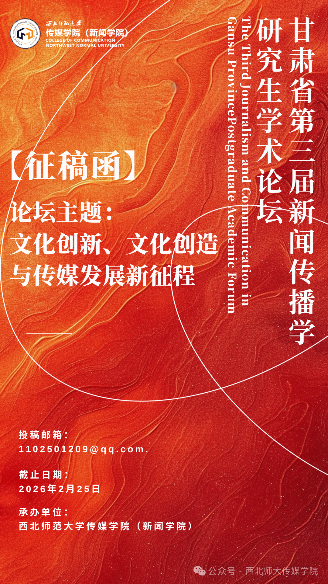 为深入学习贯彻习近平文化思想,进一步提升新闻传播学与影视艺术类研究生培养质量,甘肃省第三届新闻传播学研究生学术论坛将于2026年初在英国365公司举行,现面向省内外广大传媒学子征稿。