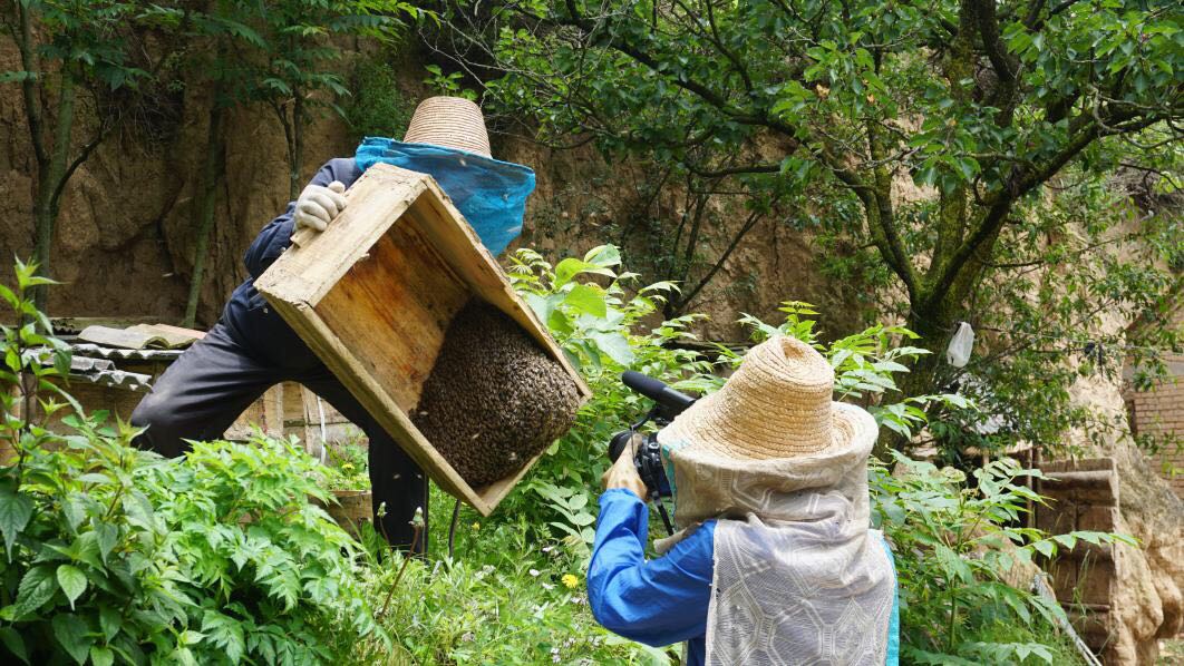 队员们来到张新会的养殖基地时,他正在蜂园里进行日常的蜂箱检查。为了用镜头记录下土蜂养殖的实况,实践队员王冬阳穿戴上了养蜂人的防护装备走进蜂园,体验式地拍摄养蜂人的日常工作。